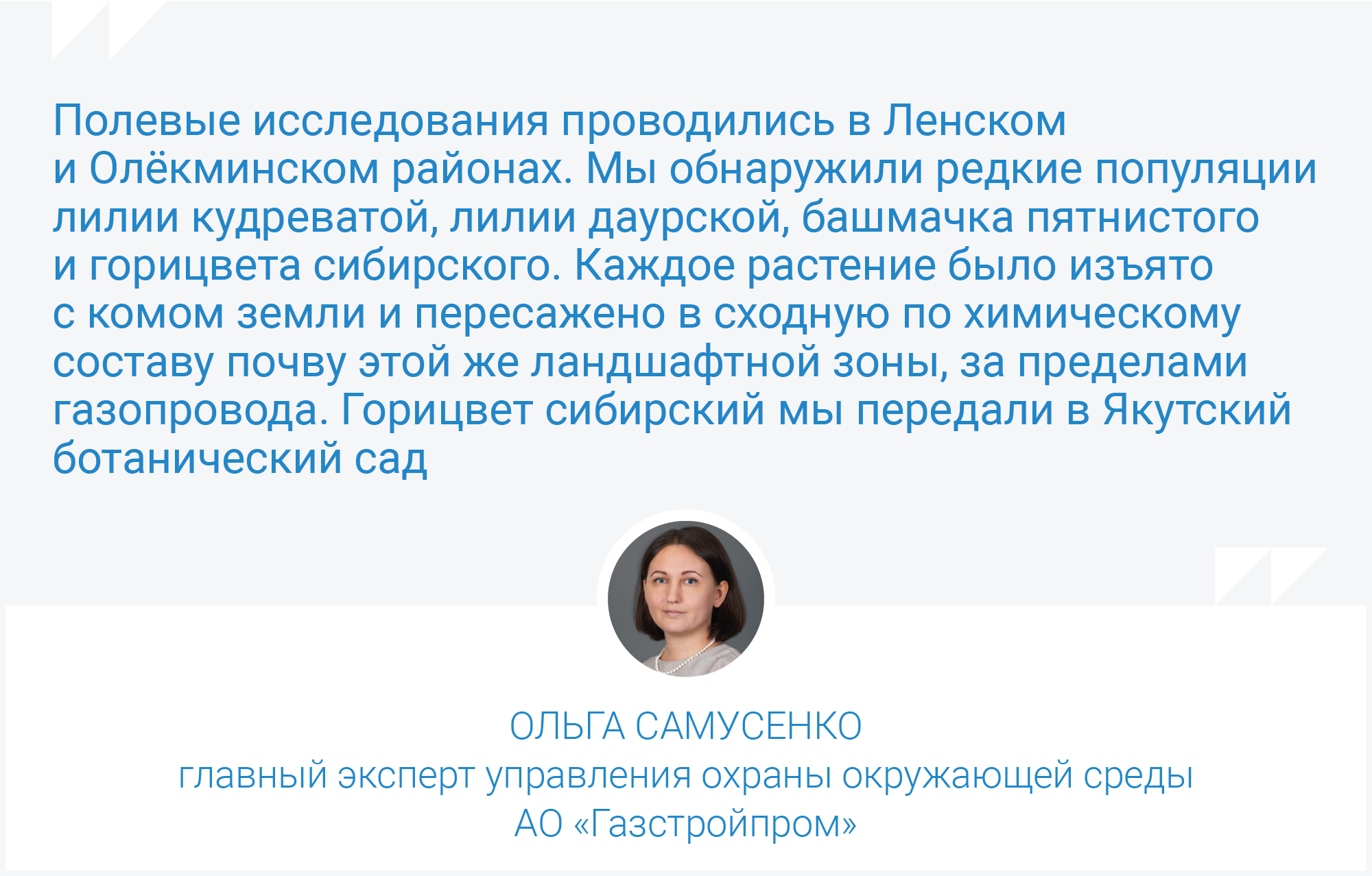 Ведутся работы и по пересадке уникальных видов растений. Например, на территории строительства лупингов магистрального газопровода «Сила Сибири» мы сохранили эндемики, занесённые в Красную книгу Республики Саха (Якутия).